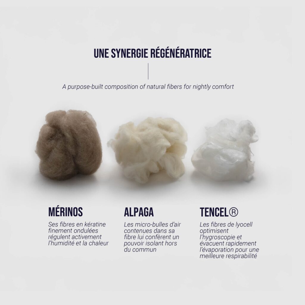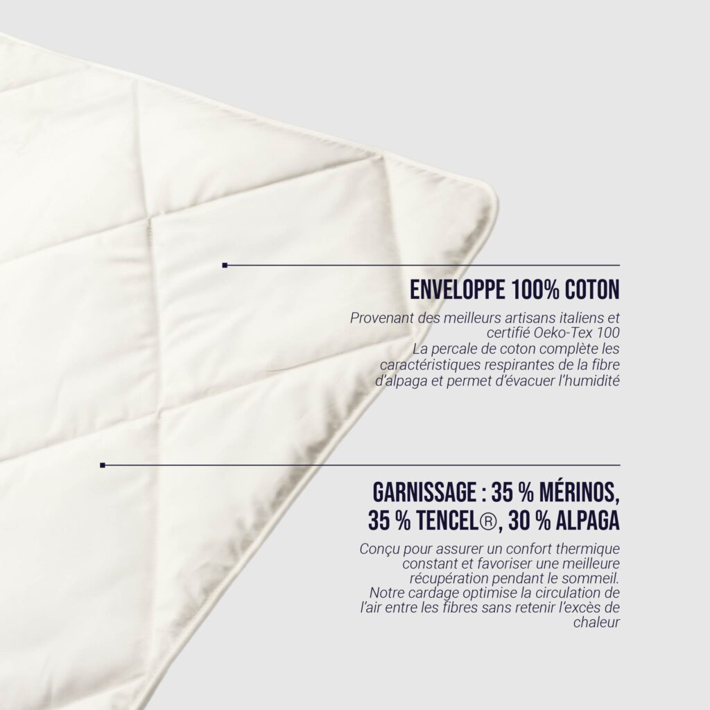 - Thermorégulatrice, respirante, hypoallergénique et naturelle.